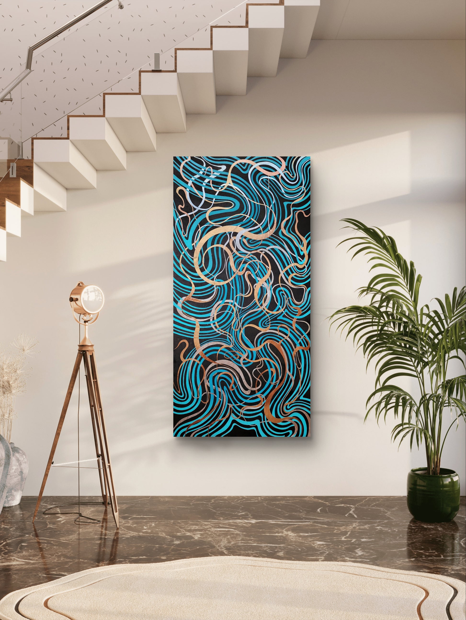 Wild Pulses is the third piece in a series that explores the tension between control and spontaneity. Created on wood using my multi-layer masking tape technique, this piece is built from three layers of hand-cut lines pulsing with rhythm, flow, and raw energy. Each layer reveals a new current, each cut a decision between freedom and form.