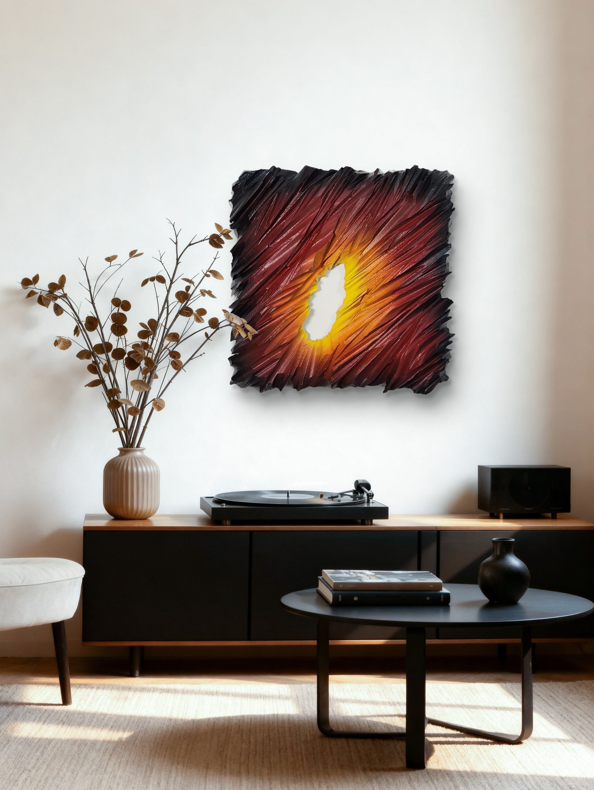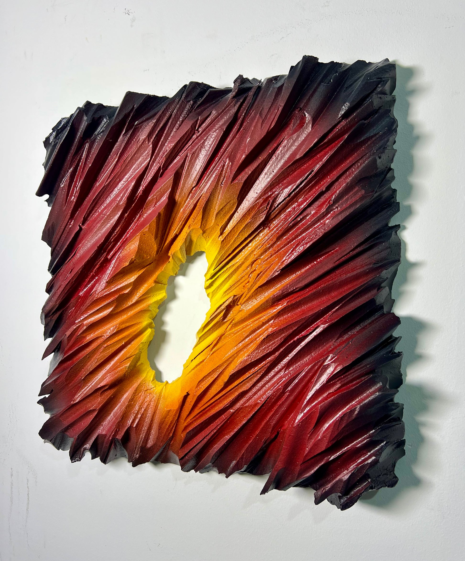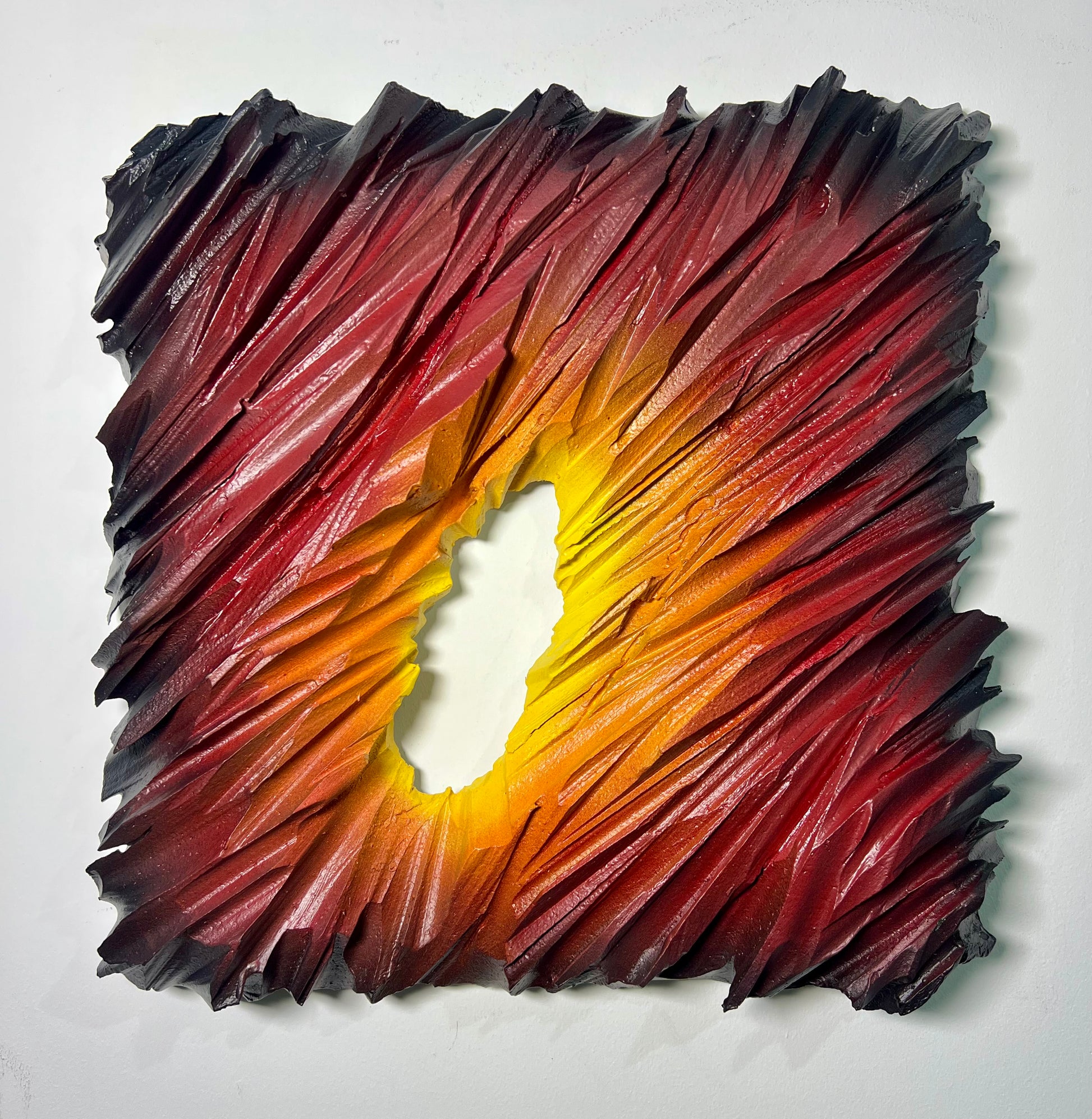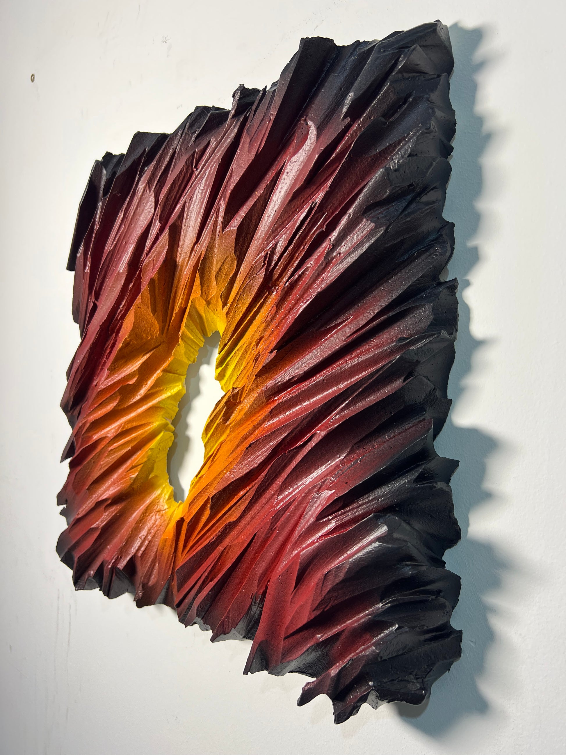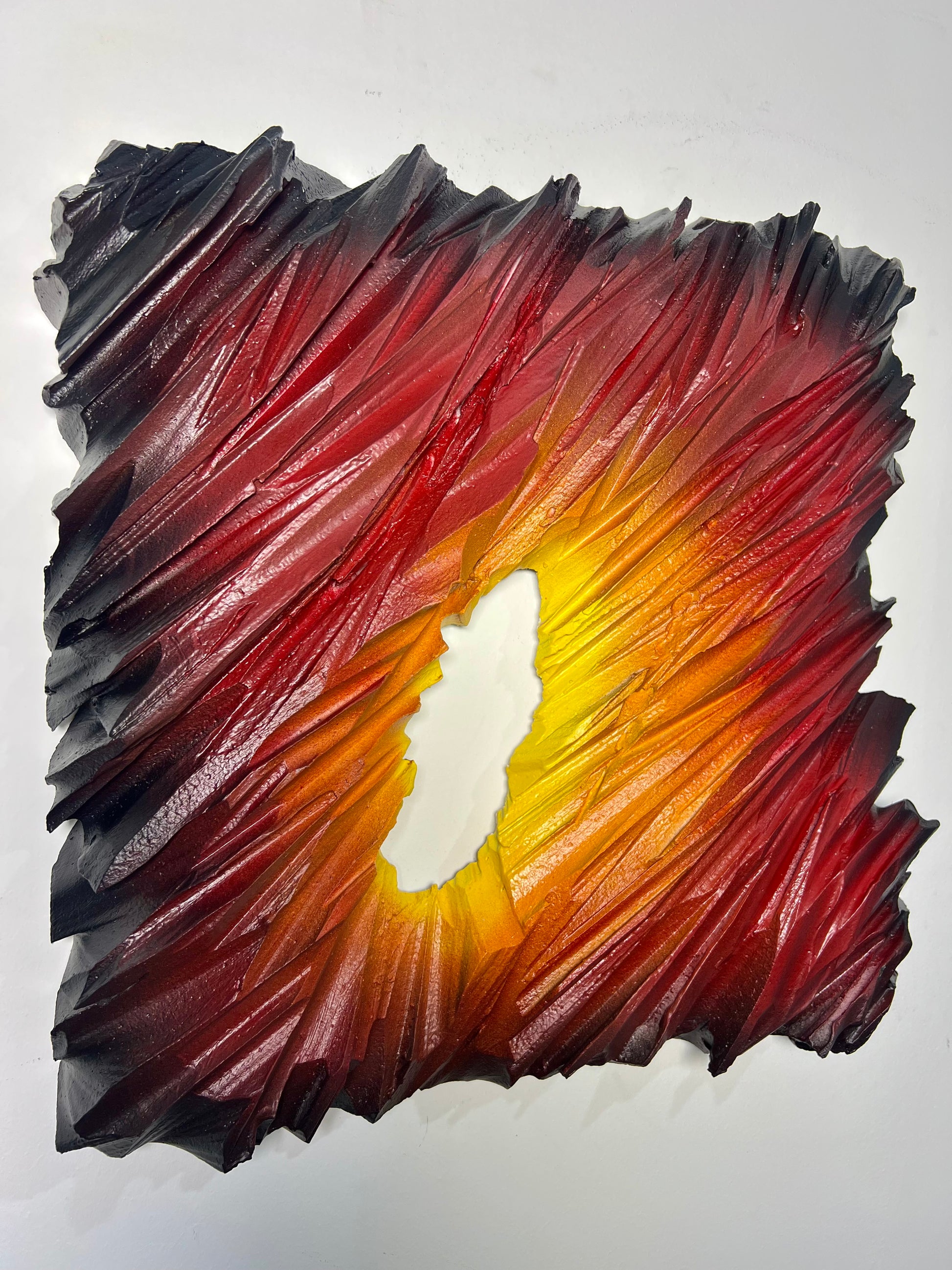 The Fire Icebergs represents the inaugural work in an innovative sculptural series, showcasing advanced material experimentation and hybrid artistic techniques. Crafted from cut polystyrene and meticulously layered with modeling paste, plaster, and PVA glue, this piece demonstrates technical precision at every stage. The surface treatment combines premium acrylic spray painting with detailed airbrush work, creating dynamic visual depth and complexity. Two protective varnish coats ensure durability while enhancing the final aesthetic. This striking sculptural form commands attention in any interior space, merging contemporary craftsmanship with bold artistic vision.